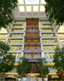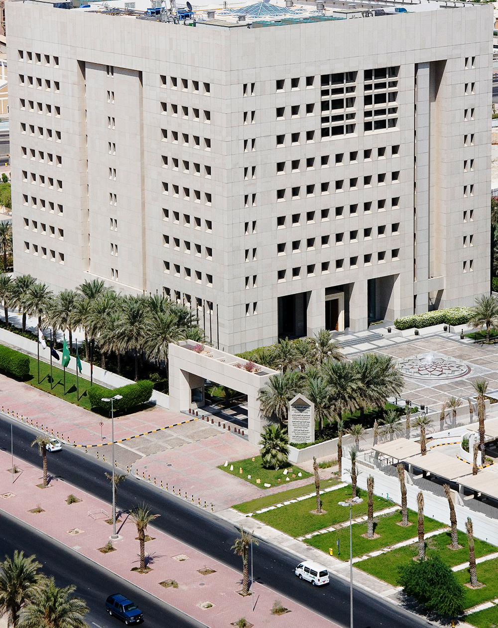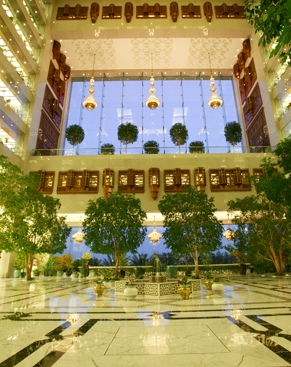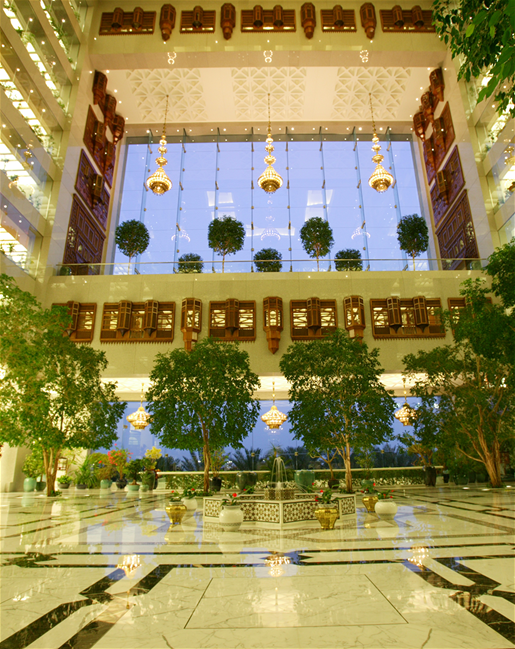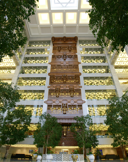 The building is articulated around a large internal atrium with one of the tallest freely suspended glass walls in the world (19 meters high). It integrates a large amount of traditional Arabic and Islamic artworks in a very modern environment. Craftsmen from all over the Arab World participated in creating masterpieces that made this building one of a kind.