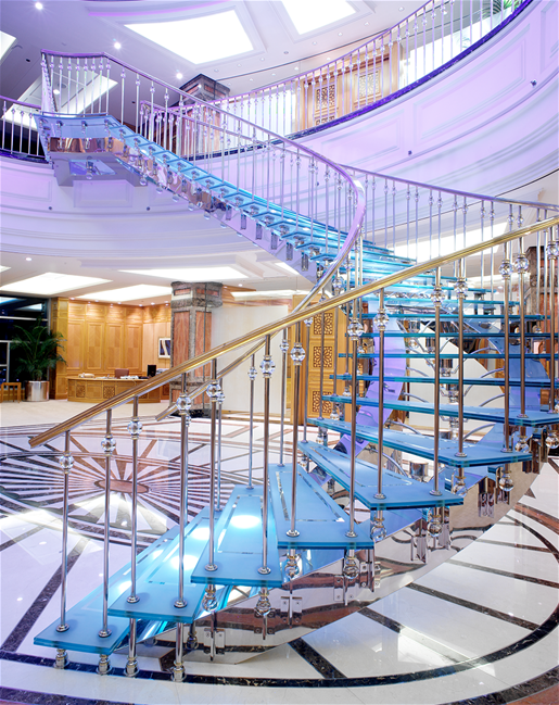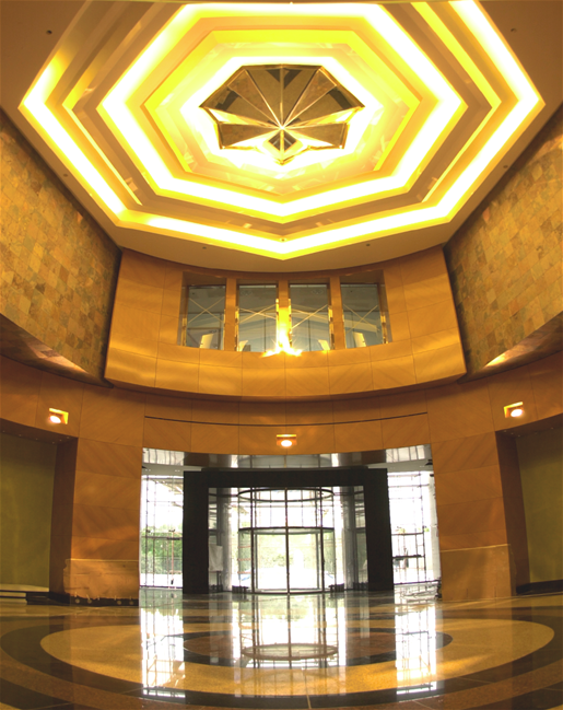 Five-storey high 60-meter long atrium, granite cladding for external facades and decorative polished granite recesses.